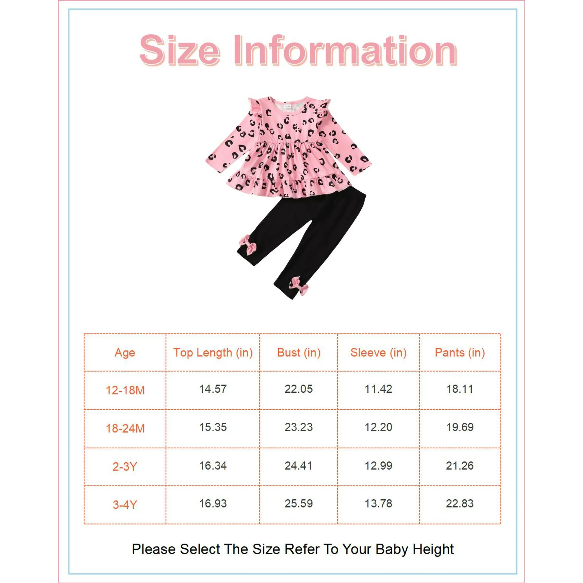 - The adorable outfits for toddler girls fit kids size from 12 months to 4T: 12-18 months, 18-24 months, 2-3 years, 3-4 years.