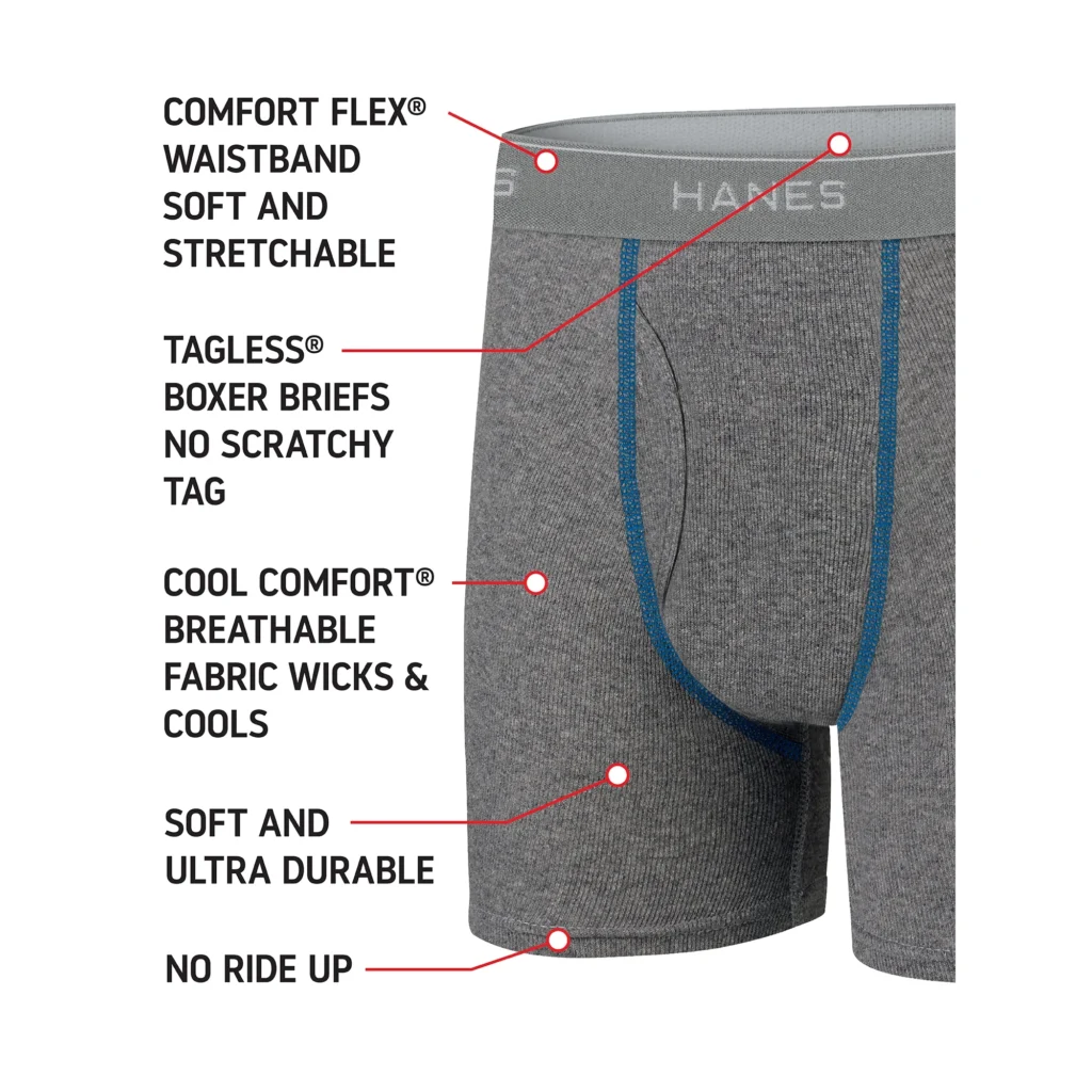 Designed to take on his day of adventure, Hanes’ Boxer Briefs are comfortable, super-soft and have a ComfortFlex waistband for a flexible, move-with-him fit. There’s just no better way to kick off his outfit of the day, than with these boxer briefs. Moisture-wicking and tag-less, these boxer briefs help keep him comfortable all day long and the no-ride-up legs are a bonus! Stock up with this budget-friendly 10-pack and he’ll be ready for anything.