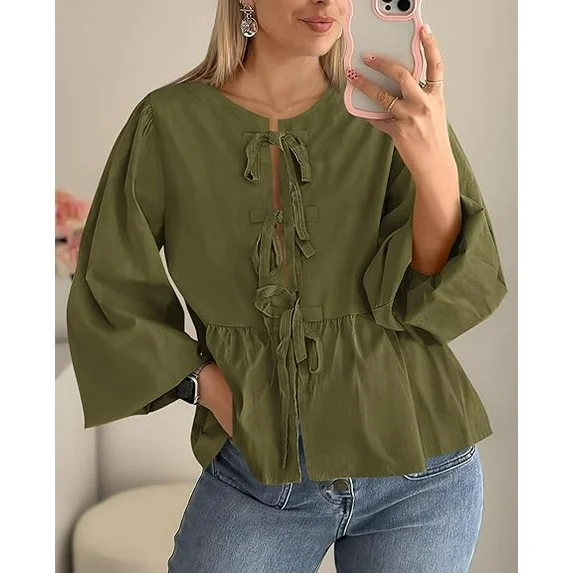 🎨Fashion Style: Puff Sleeve Blouse/ Empire Waist/ Bow Tie / Crew Neck / Peplum.
